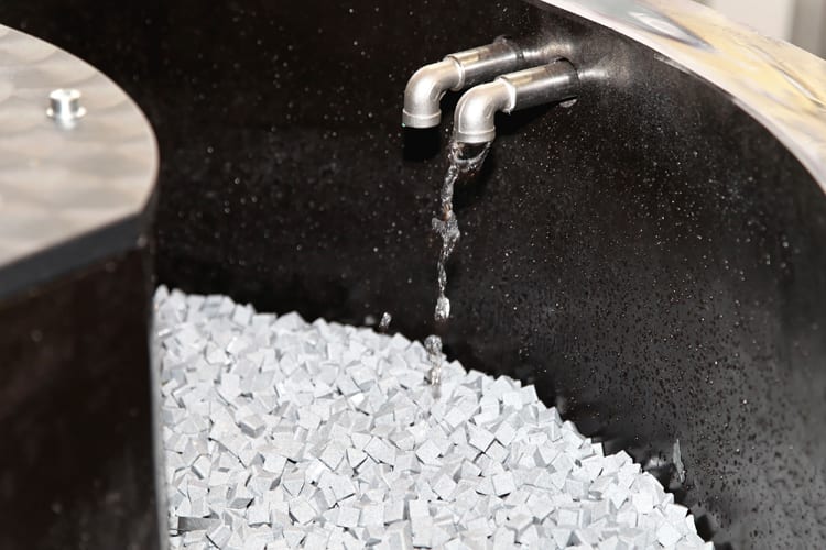 Bước 3: Đổ đá ceramic và sản phẩm cần đánh bóng vào trong lồng máy rung, ấn công tắc khởi động máy. Xả nước để làm ướt bề mặt sản phẩm và đá.