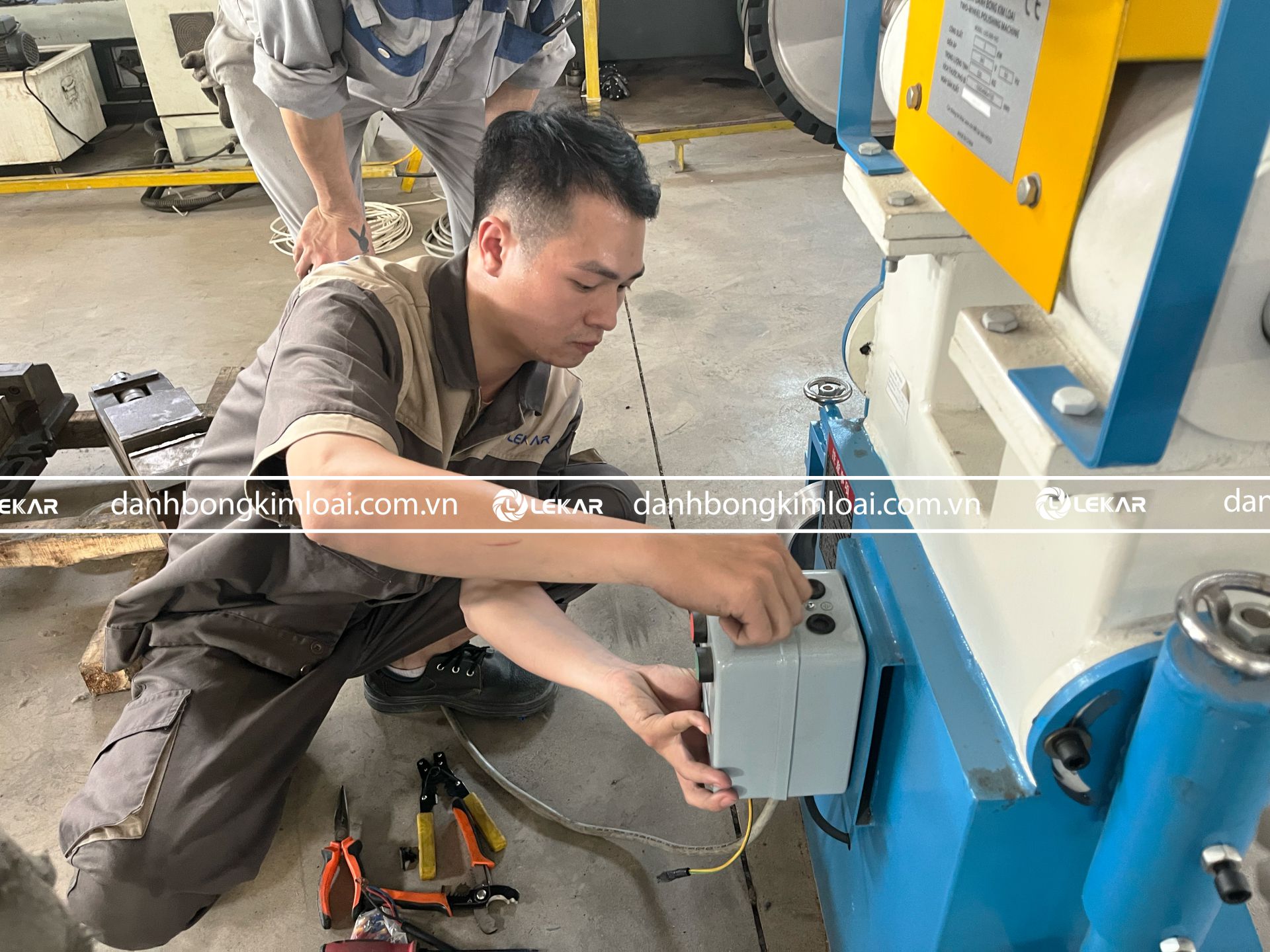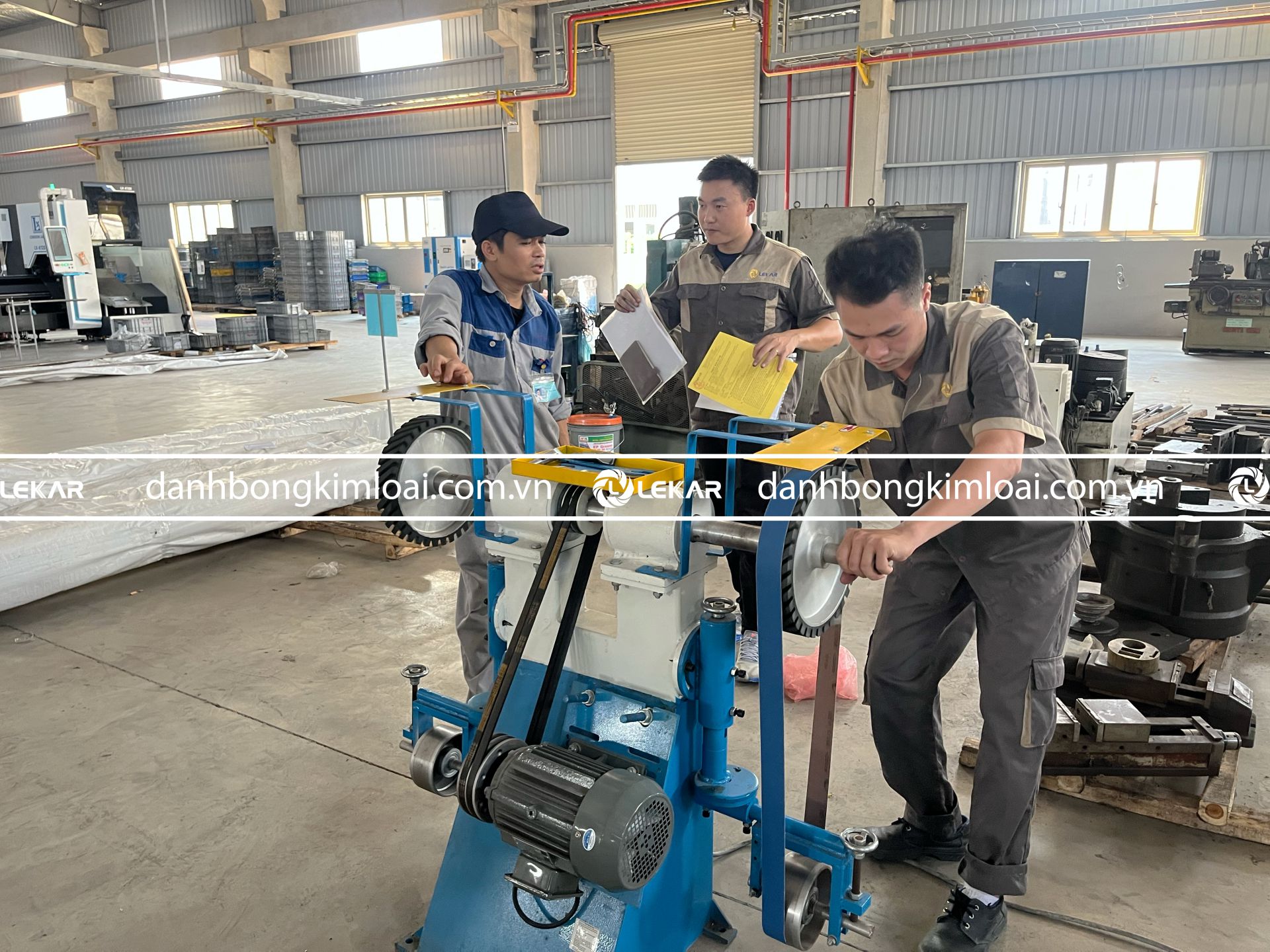 Kỹ thuật viên LEKAR tư vấn và lắp đặt máy mài giáp vòng tại nhà xưởng của khách hàng.