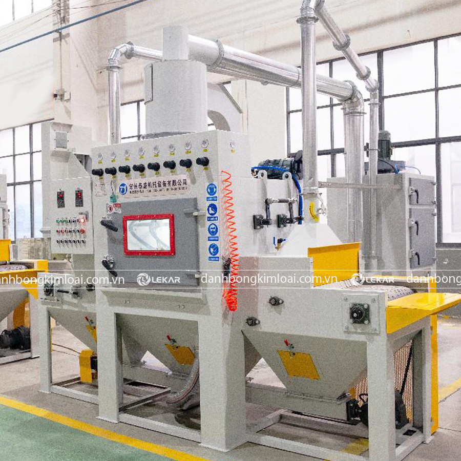 - Hệ thống băng tải liên tục được thiết kế để vận hành tự động, giúp quá trình phun cát diễn ra nhanh chóng, ổn định và đảm bảo hiệu suất cao. Cơ chế này không chỉ giúp tiết kiệm đáng kể nhân công mà còn giảm thiểu thời gian xử lý bề mặt, tăng năng suất sản xuất một cách hiệu quả.