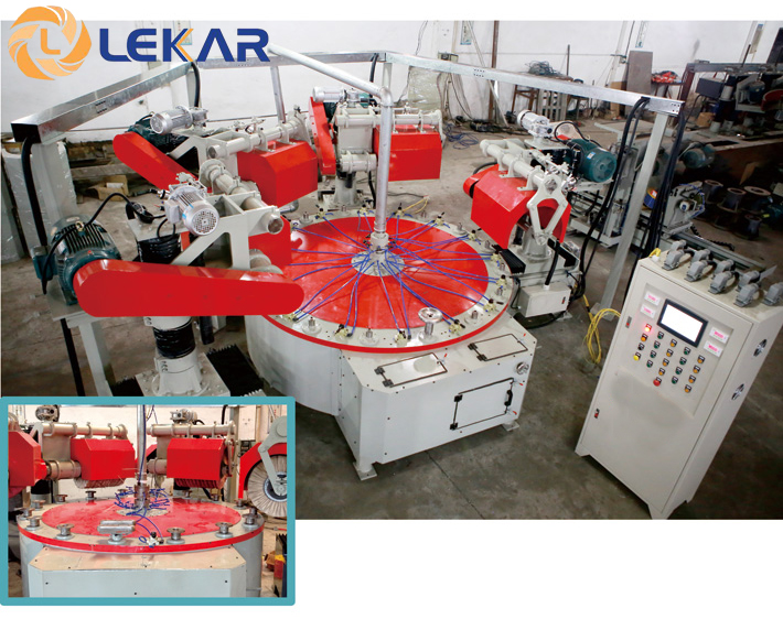 Máy đánh bóng mâm xoay liên tục 4 tổ mài LK-11C104-D1-44 là thiết bị tự động, chuyên dùng để xử lý mài, đánh xước hoặc đánh bóng hoàn thiện nhiều sản phẩm đồng dạng; qua các bước tới khi hoàn thiện.
