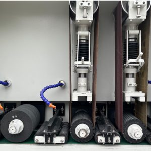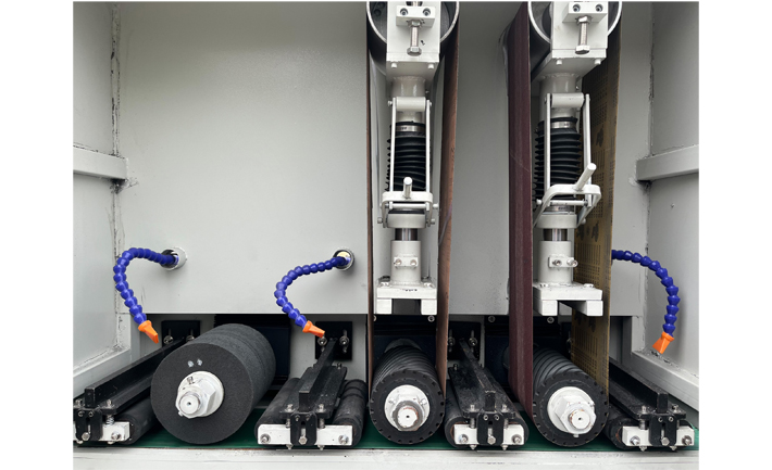 Máy đánh xước mặt phẳng nhiều tổ mài (2 tổ mài nhám đai, 1 tổ mài bánh nỉ)